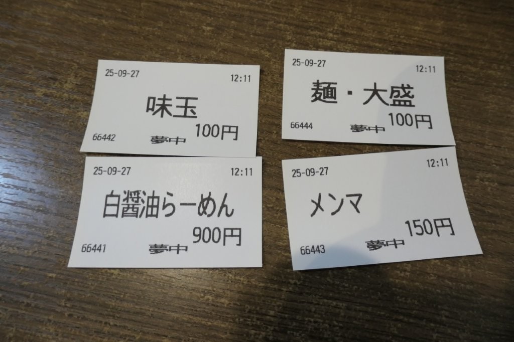 白醤油らーめん¥900 麺・大盛¥100 味玉¥100 メンマ¥150 =¥1250